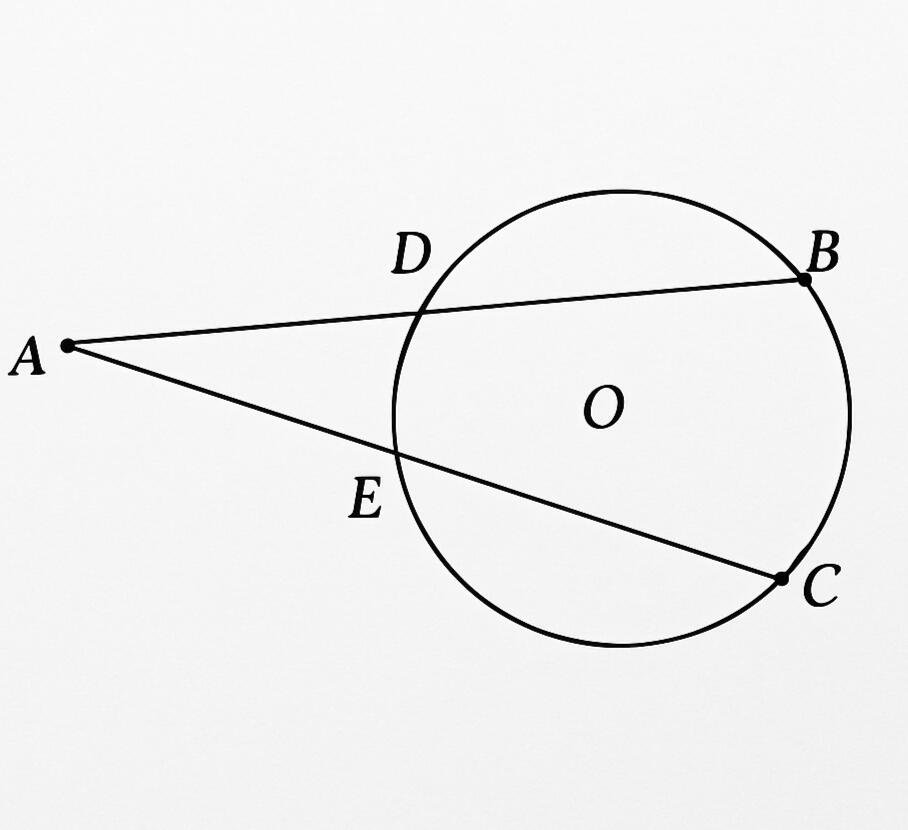 "In circle O, secants ADB and AEC are drawn from an external point A such that points D, B, E and C are on circle O."